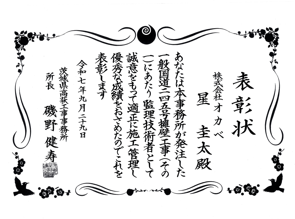 令和7年度 高萩工事事務所管内優秀技術者表彰を受賞致しました。